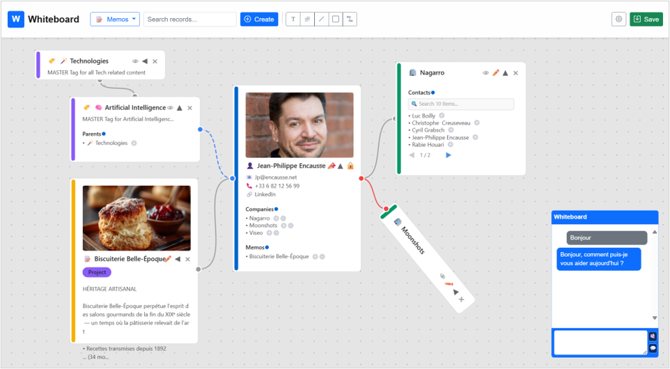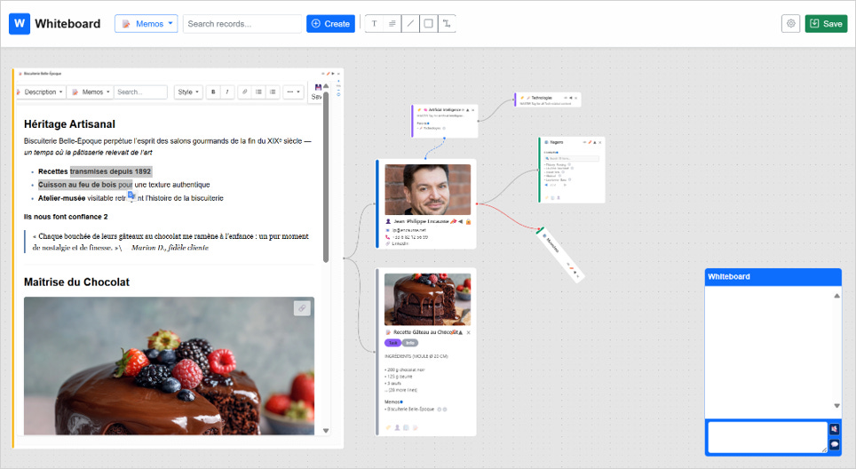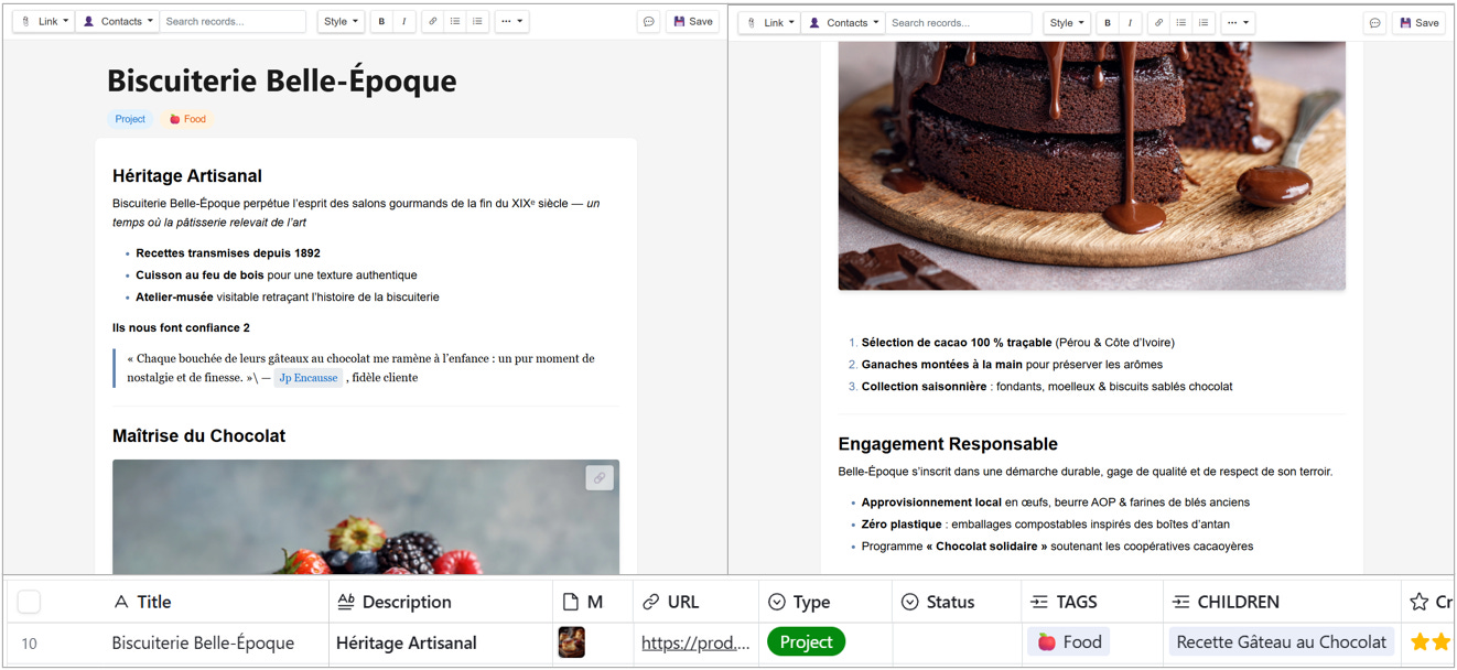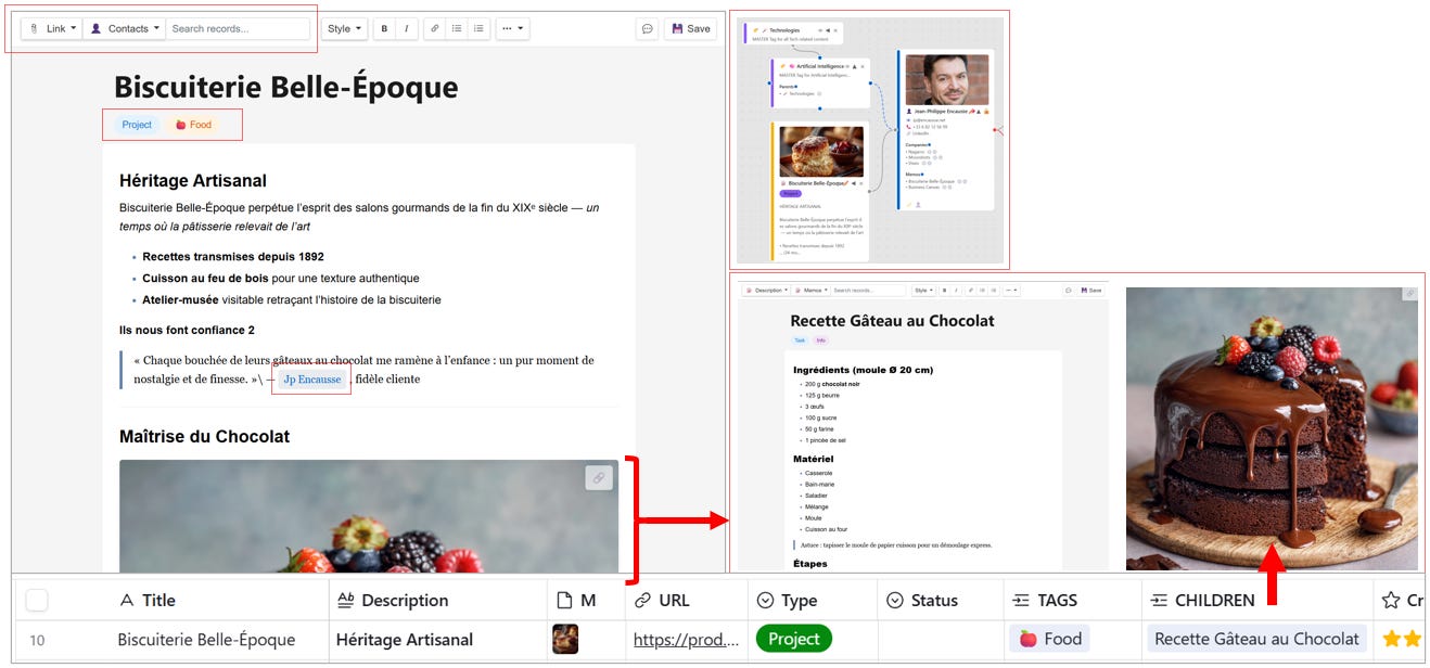 Dans cet exemple, notre Mémo, CP de lancement de La Biscuiterie Belle-Epoque est accessible depuis un editeur qui stockera l’information au format Markdown. Mais la photo provient du Mémo Recette Gâteau au Chocolat et la citation pointe un Contact.