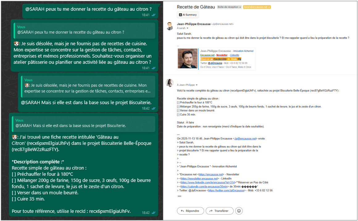 Manipuler des API exige une optimisation métier et prompt pointue (ça me fait sérieusement douter sur les MCP). Mais quand ça tourne, comme transférer une chaîne de mails illisible, c’est franchement bluffant.