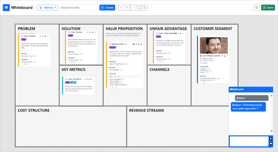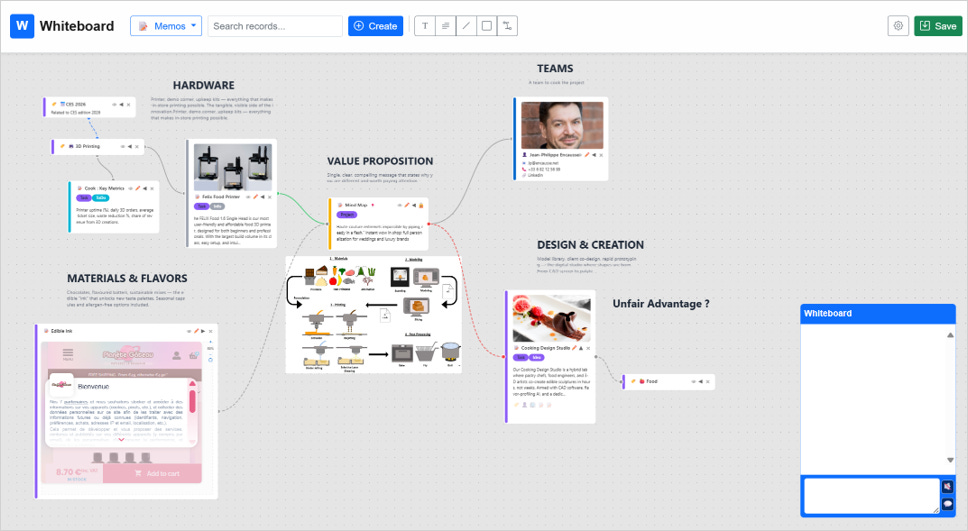 Dans cet exemple, le mémo projet tient lieu de « Business Canvas » pour organiser ses mémos enfants. Le whiteboard permet de tracer des lignes, des rectangles, ou même d’ajouter une image de fond pour des layouts façon Innovation Games.