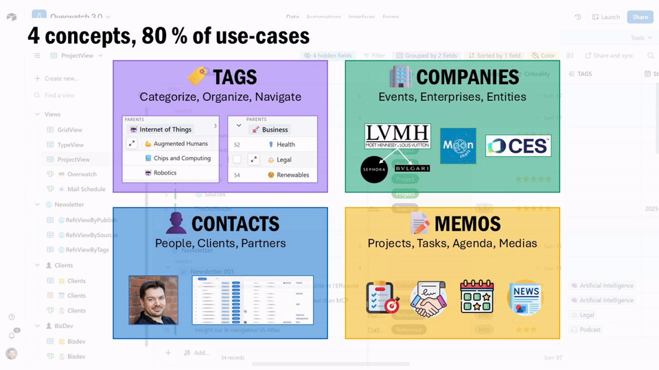 Airtable est mon outil de prédilection : Excel sous stéroïdes, adossé à un vrai modèle objet. Pourtant, la plupart des utilisateurs n’exploitent qu’environ 20 % de ses capacités : ils ne prennent pas le temps de structurer leurs données, alors que c’est indispensable pour, ensuite, interragir avec de l’IA.